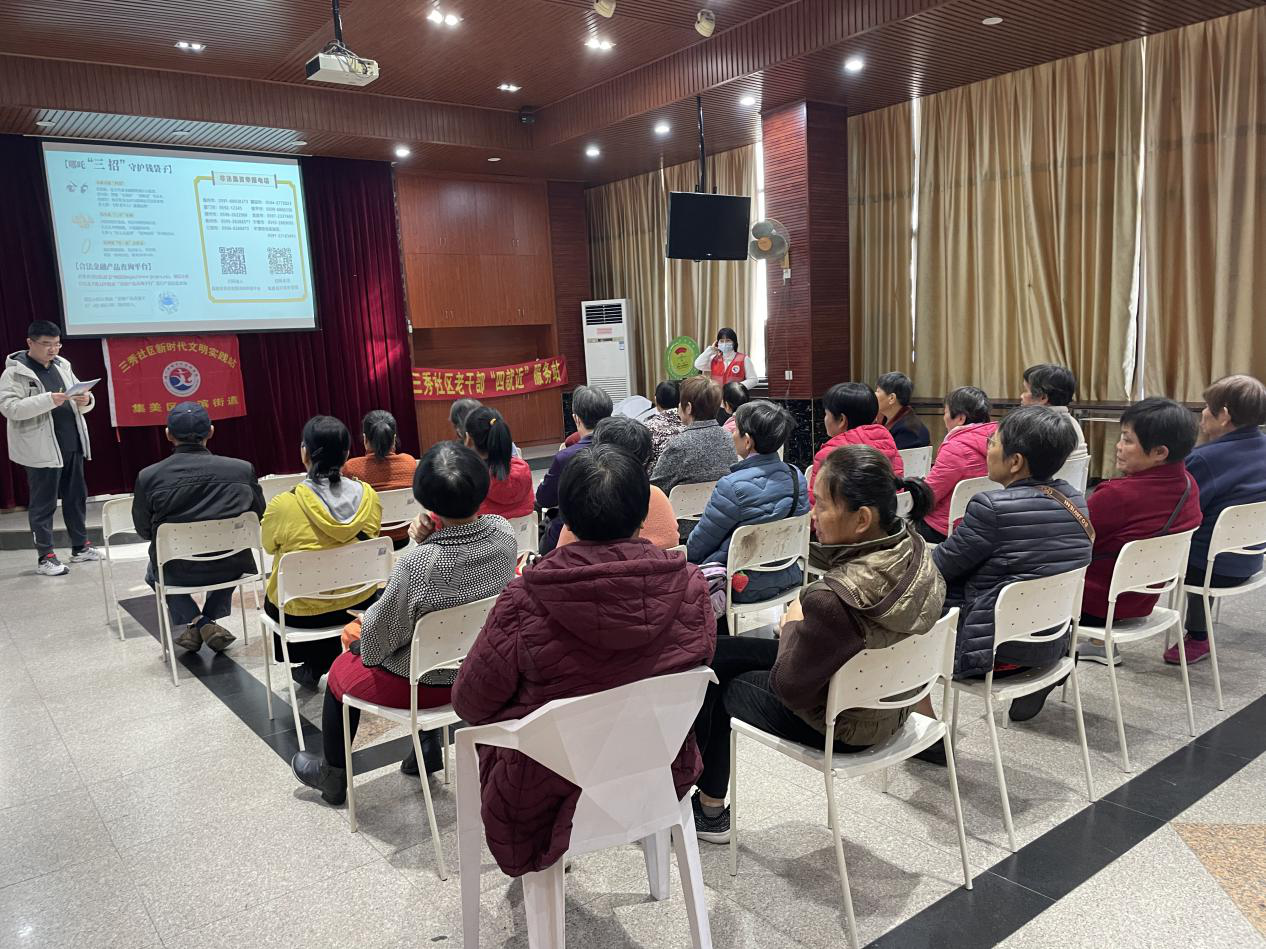 为推进诚信建设,守护老干部财产安全,提升其防范非法集资意识与能力,近日,杏滨街道三秀社区老干部“四近”服务站组织开展防范非法集资暨诚信宣传专题讲座,辖区老干部、老党员代表参加活动。